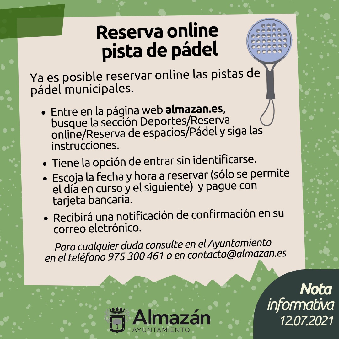 ¡Disfruta del pádel en Almazán, Soria! En Pádel Almazán te ofrecemos la posibilidad de reservar online tu pista de pádel municipal de forma rápida y sencilla. Situados en la encantadora localidad de Almazán, a orillas del río Duero y rodeados de un entorno natural privilegiado, te invitamos a disfrutar de este apasionante deporte en un ambiente inigualable. Accede a la web del Ayuntamiento de Almazán y reserva tu pista en la sección de deportes. Podrás reservar para el día en curso y el siguiente, con pago seguro mediante tarjeta bancaria. Recibirás la confirmación por correo electrónico. Para cualquier consulta, no dudes en contactar con el Ayuntamiento. ¡Prepárate para golpear la bola y pasar un rato divertido! Y si ya has disfrutado de nuestras pistas, no olvides que, según Google, hemos sido valorados con un 4.8 sobre 5, ¡un reflejo del buen ambiente y la calidad de nuestras instalaciones!